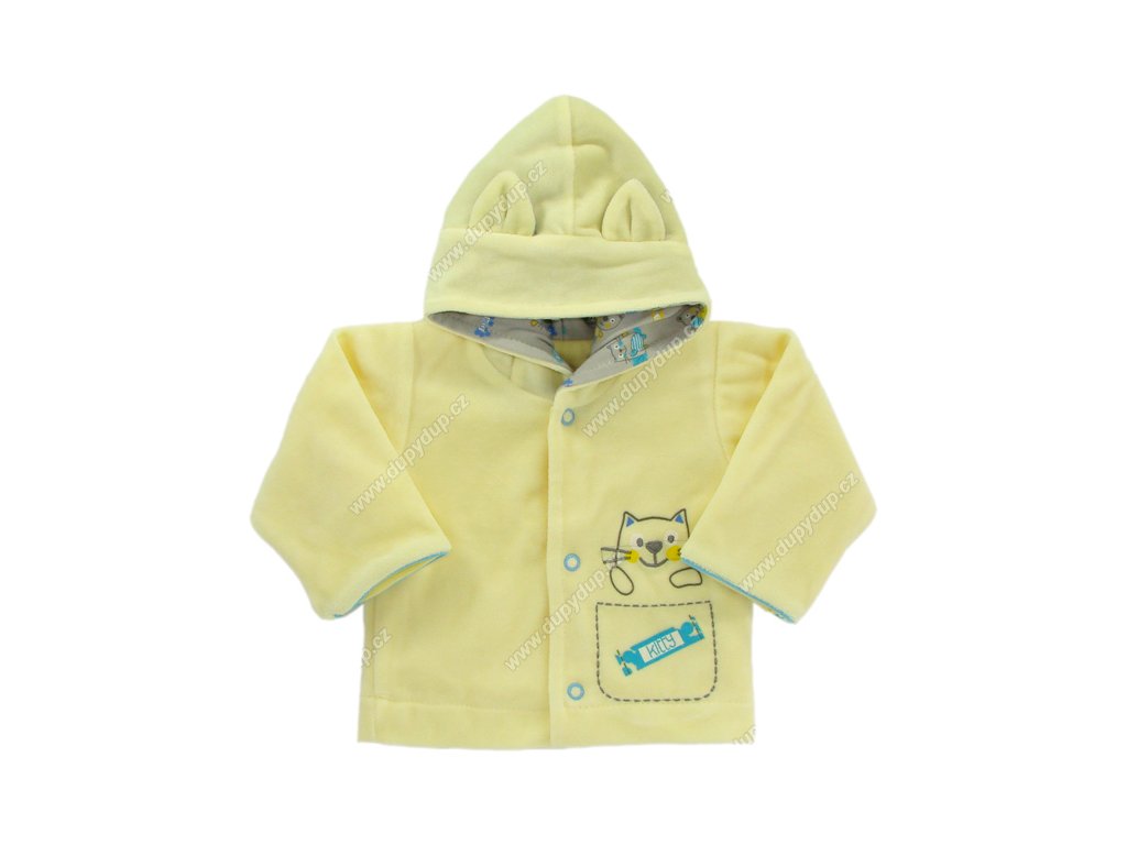 Pěkný a kvalitní sametový kojenecký kabátek s kapucí. Podšívka bavlněná. Zapínání na druky. Složení: Vrchní vrstva 80% bavlna, 20% polyester, podšívka 100% bavlna